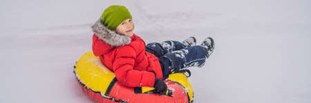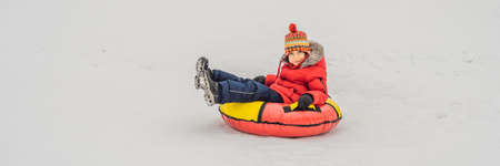 Child having fun on snow tube. Boy is riding a tubing. Winter fun for children BANNER, LONG FORMAT