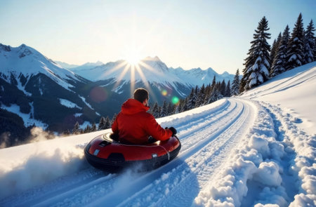 man in red jacket riding red snow tubing down snowy ski slope against snowy cliffs and forest, extreme recreation concept, back view