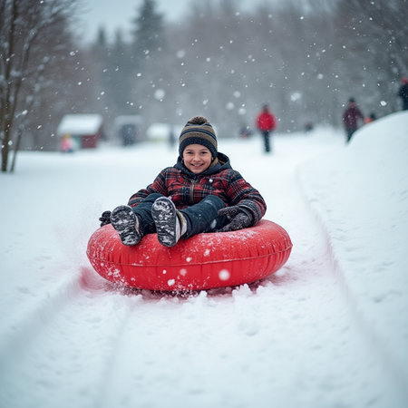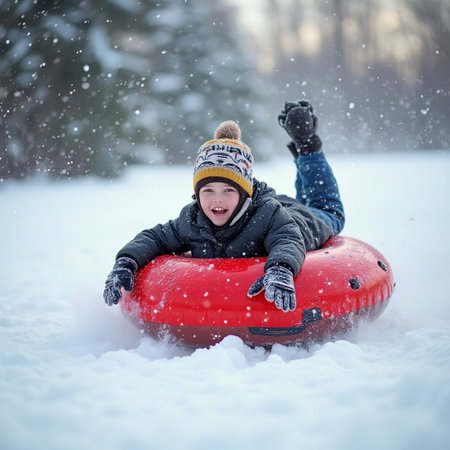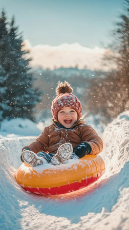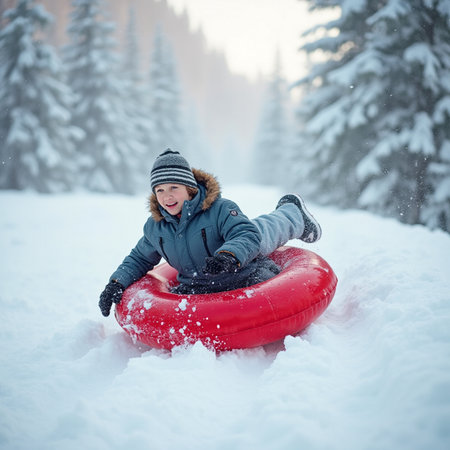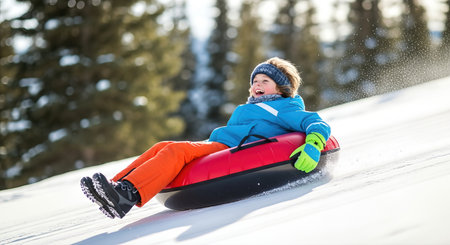 Joyful child in warm winter clothing is sledding down a snowy slope on a blue tube, with snow flying around and trees in the background, embodying winter joy and excitement
