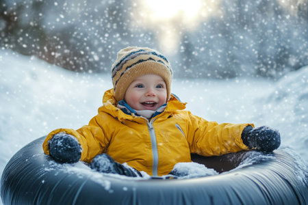 Playful toddler in yellow jacket joyfully sliding down snowy hill on a tube winter adventure fun
