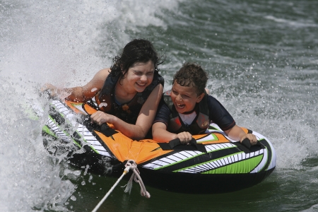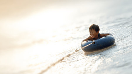 Cheerful child enjoys tubing on a sunlit body of water, showcasing the thrill of watersports. The scene captures the essence of fun and adventure in a serene, natural setting