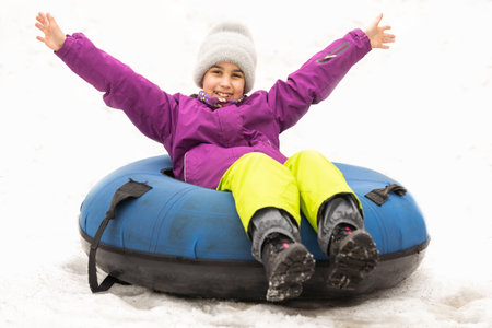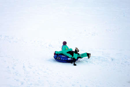 Child having fun on snow tube. Kid is riding a tubing, winter entertainment