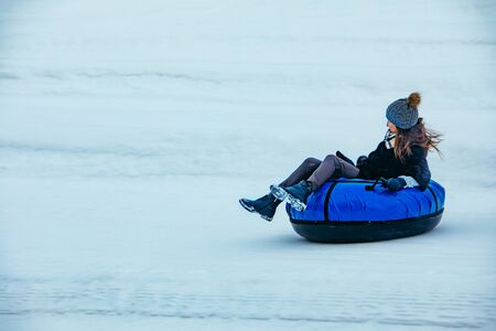 Young woman snow tube in winter park. Leisure on nature, snow slide skiing. Concept of interactive entertainment.