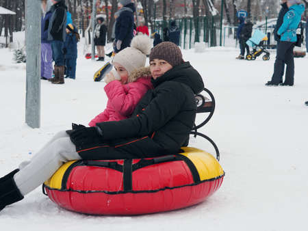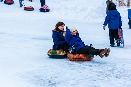 LVIV, UKRAINE - January 7, 2019: sliding down by snowed hill on inflatable tubes. winter fun activities. speed motion