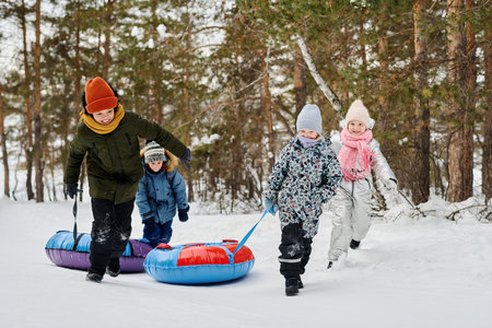 Group of cute cheerful children in winterwear running down forest road on winter day and laughing while pulling their snow tubes