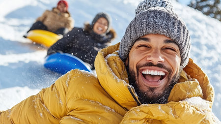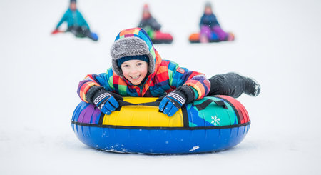 Caucasian boy sliding down snowy hill on colorful snow tube enjoying winter fun with friends in playful outdoor adventure. concept of childhood joy, winter sports, exciting activities.