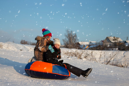 On a winter day, children go sledding and laugh merrily. A boy and a girl go down the mountain on a sled. Children in the winter in the village on vacation.