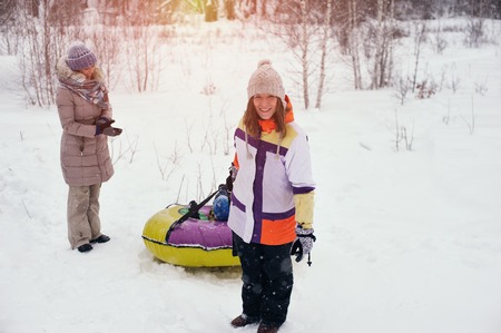 Young family on a winter family vacation. Little child girl with a cup of warm cocoa outdoors for Christmas. Riding from a snowy mountain on rubber tubes. Alternative to computer games.