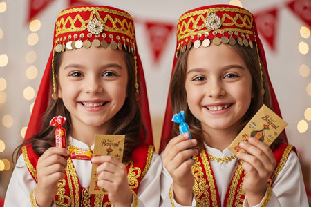 Two Turkish children dressed in traditional festive attire, smiling while holding colorful candy and gift envelopes, celebrating Eid with joy.
