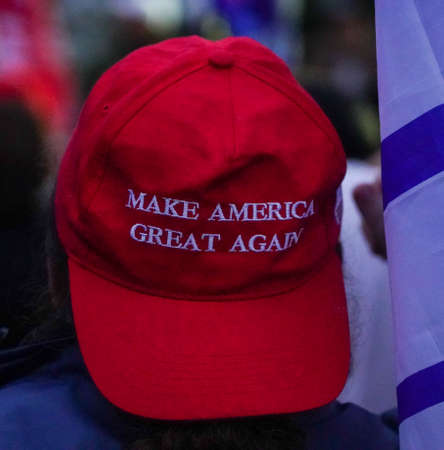 BROOKLYN, NEW YORK - OCTOBER 25, 2020: President Trump supporter wears Make America Great Again hat. President Trump supporters participate at New York for Trump 2020 rally in Brooklyn, New York