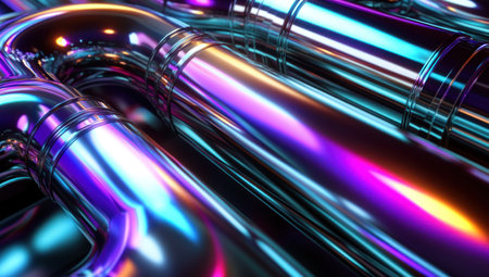 This abstract image showcases a stunning array of metallic pipes illuminated by colorful lights, creating a vibrant and modern artistic effect ideal for various design projects.