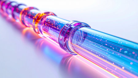 Data flows at the speed of light through a glowing fiber optic pipeline, its vibrant colors representing the massive streams of information connecting the world.