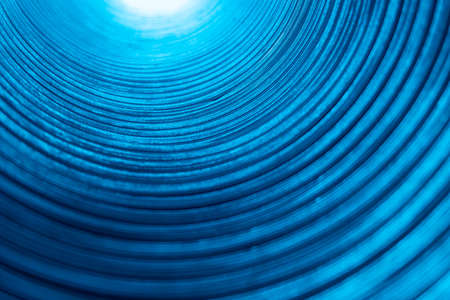 Abstract black spiral swirl inside a big shiny metal pipe, cold blue toned black and white