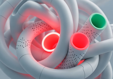 A close-up view of a complex, interwoven structure of white tubes, some emitting a vibrant red glow, while others feature green and red openings, creating a visually striking abstract composition.