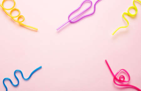Five multi-colored tubules for drinks on a pink background. Straws for cocktails of different shapes. The concept of a holiday, celebration of events and parties. Place for text.