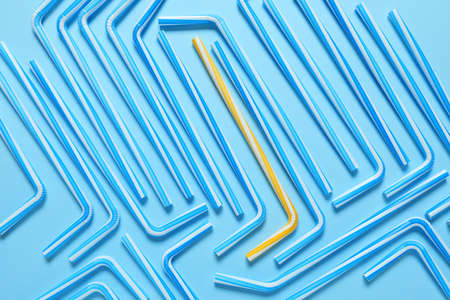Yellow cocktail straw among blue ones on color background. Concept of uniqueness