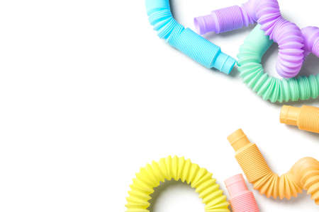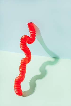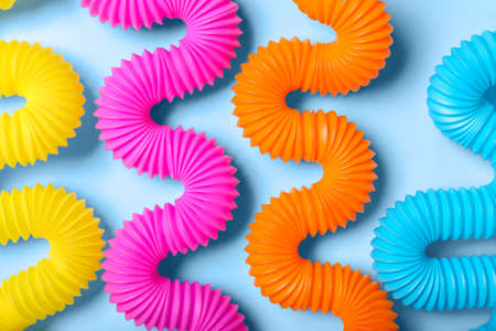 Multi-colored corrugated plastic pipes on a bright background. Popular poptube game in the form of simple shapes and winding lines on a colorful background