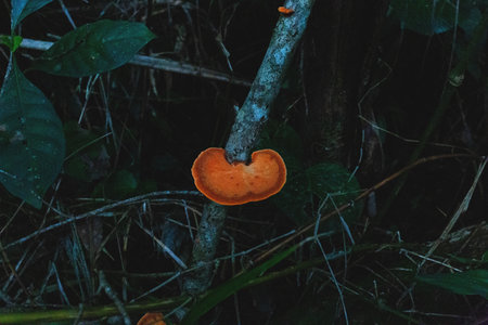 A bright orange mushroom grows on a branch in a dark, dense forest scene