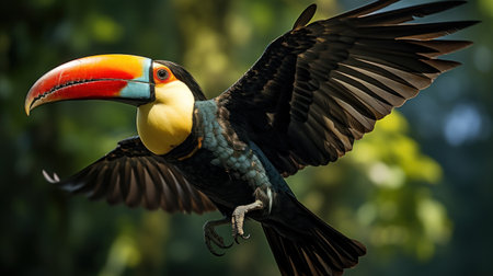 A photograph depicts a toucan perched on a branch in a rainforest. Its colorful beak shines brightly. The background features lush green leaves and foliage, creating a natural setting for the bird's vibrant plumage. --ar 3:2 --v 6.1 Job ID: a757bd32-d35b-431f-b0ed-68cc90ec3b99