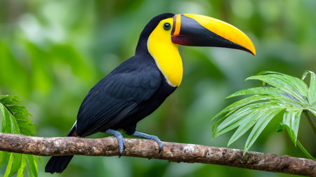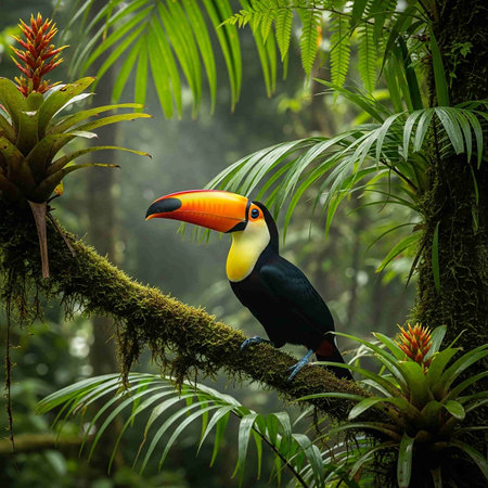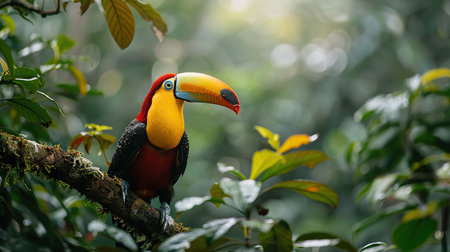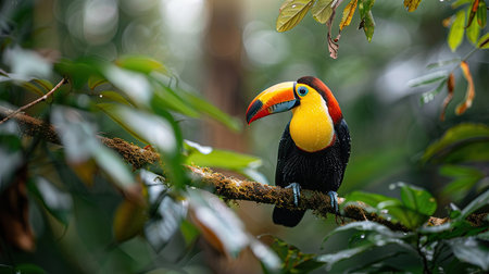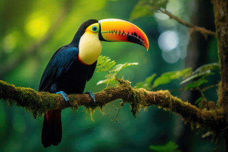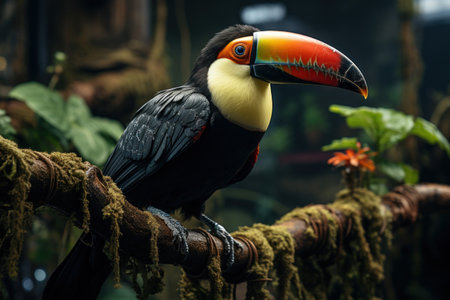 Vibrant toucan perched on rainforest tree branch in its natural habitat in the jungle
