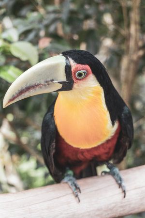 Red breasted toucan colorful bird in tropical nature jungle forest birds park and zoo in Foz do Iguacu State of Parana Brazil.