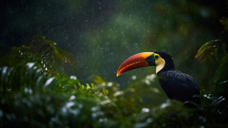 ai generated, toucan, bird, beak, wildlife, fauna, nature, orange, tropical, beautiful, red, animal, colorful, natural, background, wild, green, yellow, forest, south american, clouds, eco, plants, woods, toucans, birds, big bird, zoo, jungle, branch, illustration, black, exotic, colored, design, isolated, tree, drawing, leaves, evening, vector image, bushes, environment, creepers, outdoor, amazon, misty, lush, leaf, branches