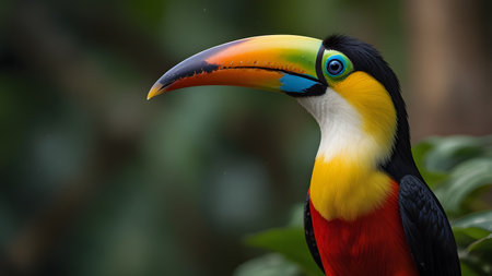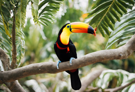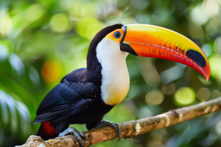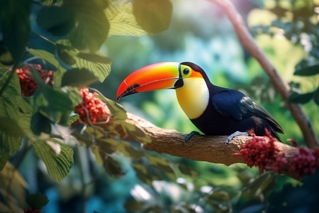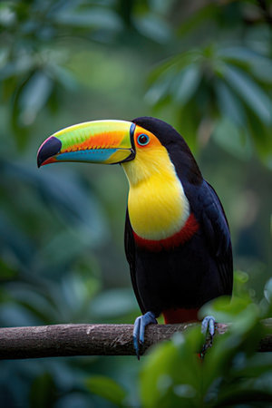 A vibrant toucan perches on a branch in the lush rainforest. Its colorful plumage contrasts beautifully with the surrounding greenery. The bird's beady eyes survey its surroundings, alert to any potential threats. The air is filled with the sound of its raucous call, echoing through the dense foliage.