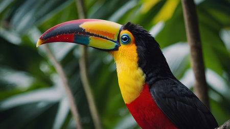 A vibrant toucan perched on a tree branch, surrounded by lush jungle foliage. Its beak showcases brilliant hues of orange, yellow, and blue, creating a lively and tropical aesthetic.
