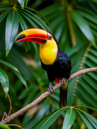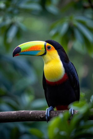 Vibrant Toucan Perched on a Branch Surrounded by Lush Green Foliage in a Tropical Setting