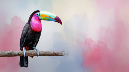A beautifully captured toucan perches gracefully on a branch, showcasing its colorful feathers and striking beak against a soft pastel background, celebrating nature's artistry.