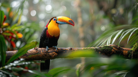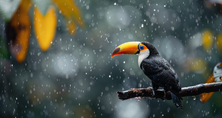 A toucan sits on a branch in the rainforest, rain falling around it. The toucan's large, colorful beak is visible, and its black feathers are wet from the rain.