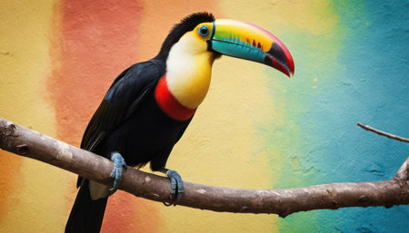 Toucan sitting on a branch in front of a colorful wall