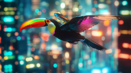 Exotic toucan with neon rainbow beak flying over a futuristic horizon, soft glow around the bird, generative ai