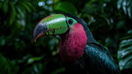 Close-up of a colorful toucan in the rainforest.