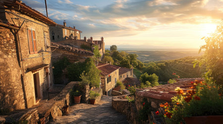 The warm glow of sunset bathes an old Tuscan village, with its historic stone buildings and rolling hills in the background. Resplendent.