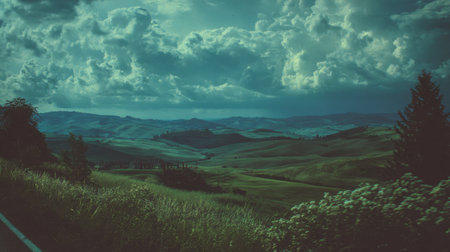A captivating view of rolling hills adorned with lush greenery, set against a backdrop of dramatic clouds, creating a serene and tranquil rural landscape.