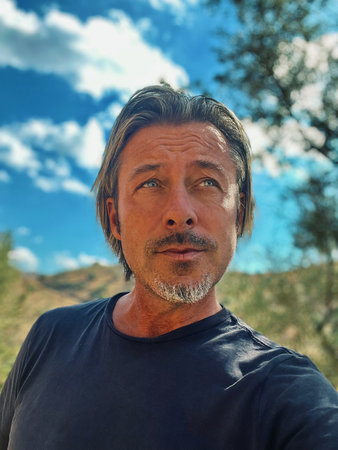 Middle aged man with blond half long hair and grayish beard outdoor in nature on a sunny day. Satisfied and relaxed expression on his face.