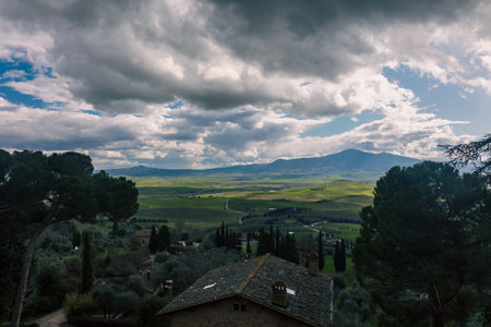 Wavy fields in Tuscany with shadows and farms, Italy. Natural outdoor seasonal spring background with blue dramatic sky and clouds.