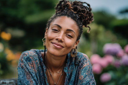 Smiling female with natural hair, dressed in a colorful blouse, enjoys a serene outdoor setting filled with blooming flowers and lush greenery, radiating happiness and warmth