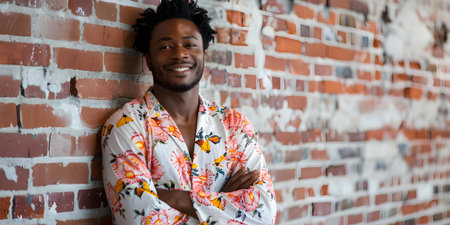 A content young Black man in pajamas smiles confidently against brick wall. Concept Photography, Portrait, Posing, Confidence, Lifestyle