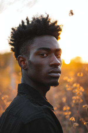 Portrait of a young african american man with afro hairstyle in a field at sunset