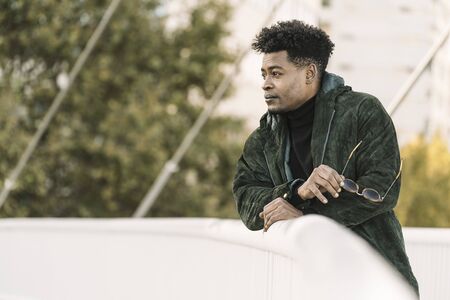 attractive young african black man with green jacket and sunglasses while leaning on a handrail outdoors in the city, lifestyle concept