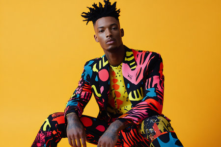 Man with dreadlocks wearing a vibrant, abstract patterned suit, sitting against a bright yellow background