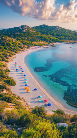The serene sandy beaches of Chia reveal gentle dunes, vibrant beach umbrellas, and sparkling blue waters under the warm sunlight, embodying coastal charm.