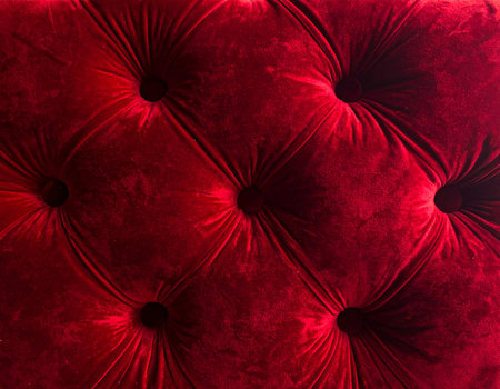 A close-up texture of a red chester-style sofa with dotted button patterns, showcasing its luxurious and classic look.