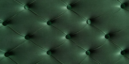 Green velvet capitone textile background, retro Chesterfield style checkered soft tufted fabric furniture diamond pattern decoration with buttons, close up