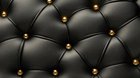 This image displays luxurious black leather upholstery adorned with golden buttons. The sophisticated design enhances interiors with its rich texture and appealing detail.