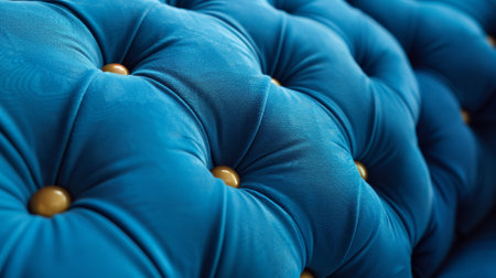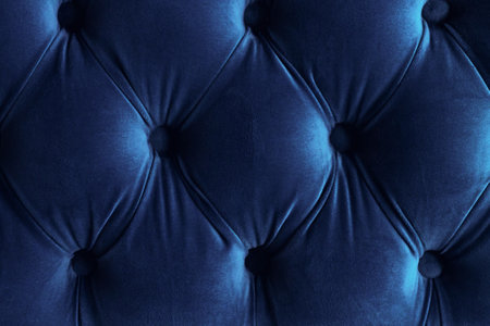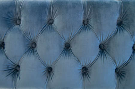 Velour surface of sofa close-up. Coach-type velours screed tightened with buttons. Blue chesterfield style quilted upholstery backdrop close up.