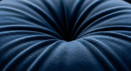 A macro close-up shot of a plush, dark blue velvet or velour cushion, showing the deep tufted center. The soft, luxurious fabric catches the light, creating radial folds and a rich texture. The image conveys a sense of comfort, elegance, and luxury.