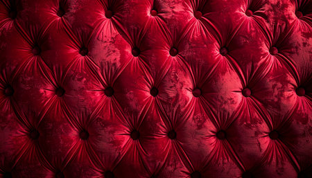 Detailed view of textured red velvet upholstery with a diamond pattern and prominent button details, highlighting its luxurious feel.